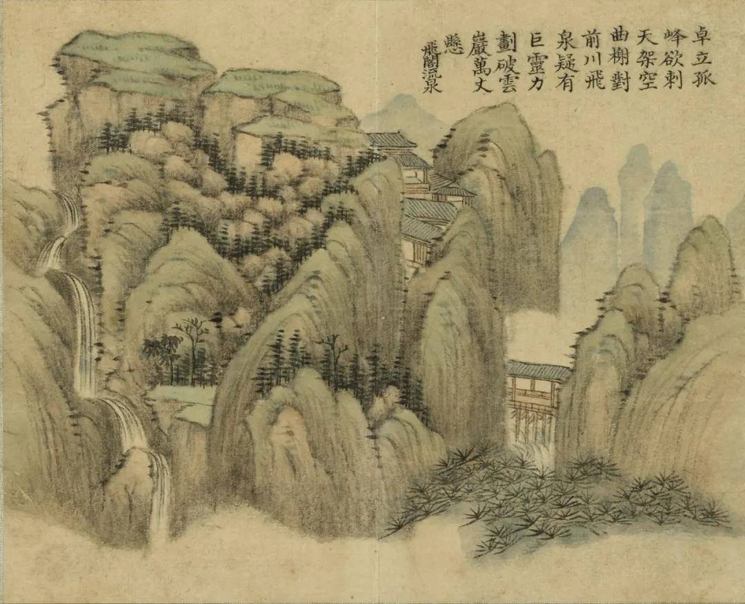 卓立孤峰欲刺天。架空曲榭对前川。飞泉疑有巨灵力。划破云岩万丈悬。飞阁流泉。