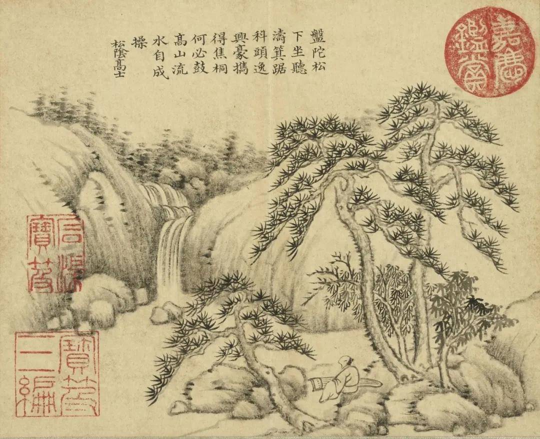 盘陀松下坐听涛。箕距科头逸兴豪。携得焦桐何必鼓。高山流水自成操。松阴高士。